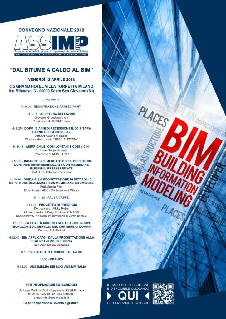 Il prossimo venerdì 13 aprile, saremo presenti al consueto Convegno annuale targato ASSIMP Italia. “DAL BITUME A CALDO AL BIM” è il tema dell’edizione 2018 che, anche quest’anno, ci vede protagonisti con uno spazio espositivo nel quale presenteremo le nostre migliori novità nel campo dell’impermeabilizzazione e dell’isolamento.